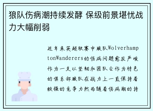近年来,英超联赛中,狼队(Wolverhampton Wanderers)的伤病问题愈发严峻。作为一支以坚韧和团队合作为特色的俱乐部,狼队在战力上一直保持着较强的竞争力。然而,随着伤病潮的持续发酵,狼队的保级前景变得愈发堪忧。伤病问题不仅影响了球队的整体表现,还对球员的状态、教练的战术部署、球队的精神面貌以及对手的战术针对产生了深远的影响。本文将从四个方面详细分析狼队伤病潮的严重性,以及它如何削弱球队战力,威胁到球队的保级前景:一是球队伤病问题的现状及其对整体战力的影响;二是主要球员的伤缺如何影响战术布局与整体竞争力;三是伤病潮对球队士气及精神状态的影响;四是狼队如何应对伤病潮及其未来保级前景的展望。